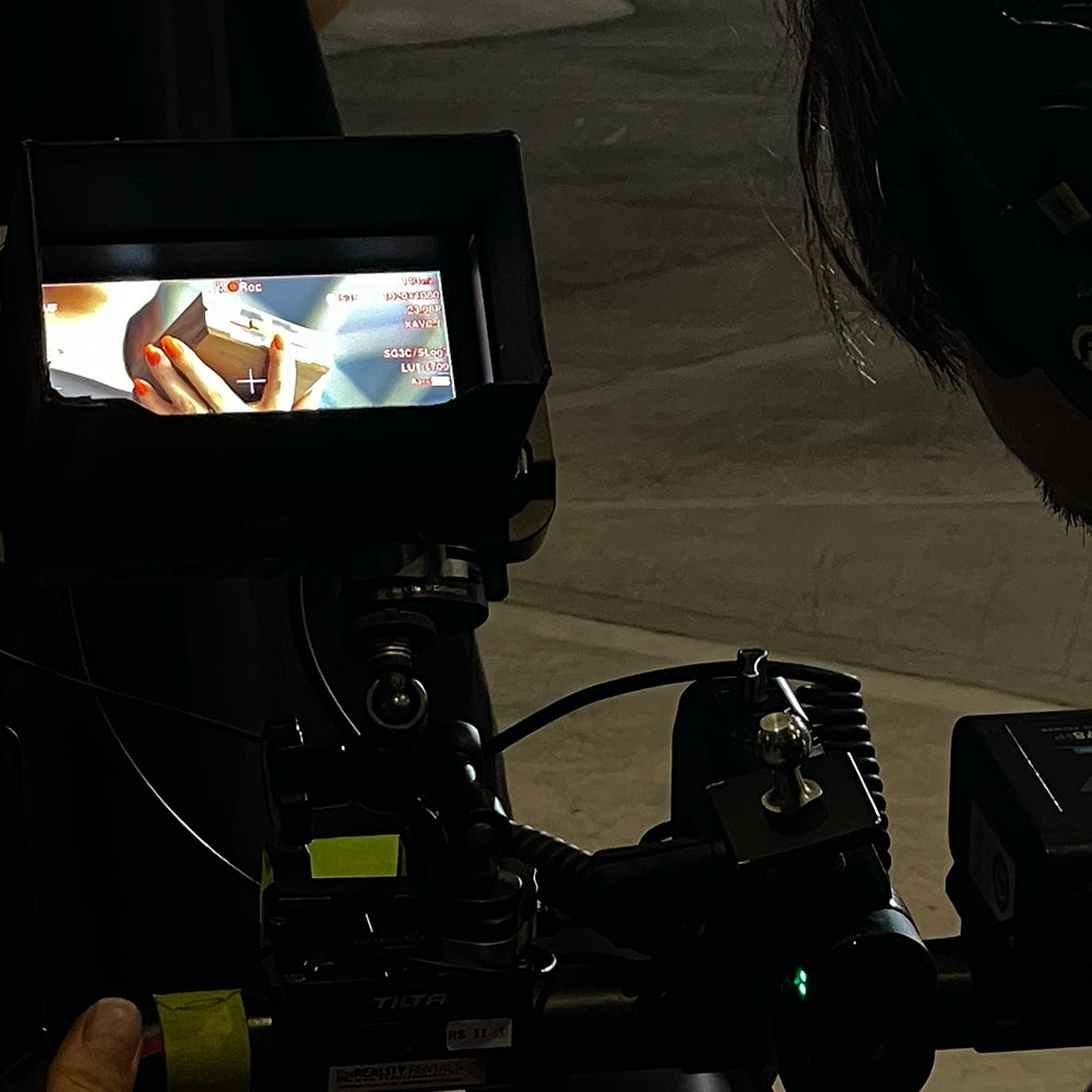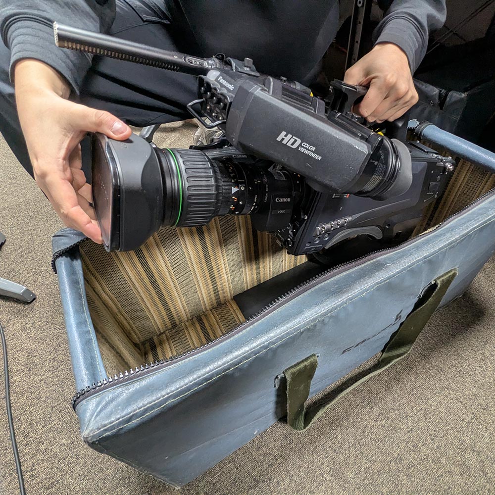 カメラ以外にもディレクターの映像確認用にポータブルモニターや室内撮影用に照明機材なども現場に合わせて用意します。