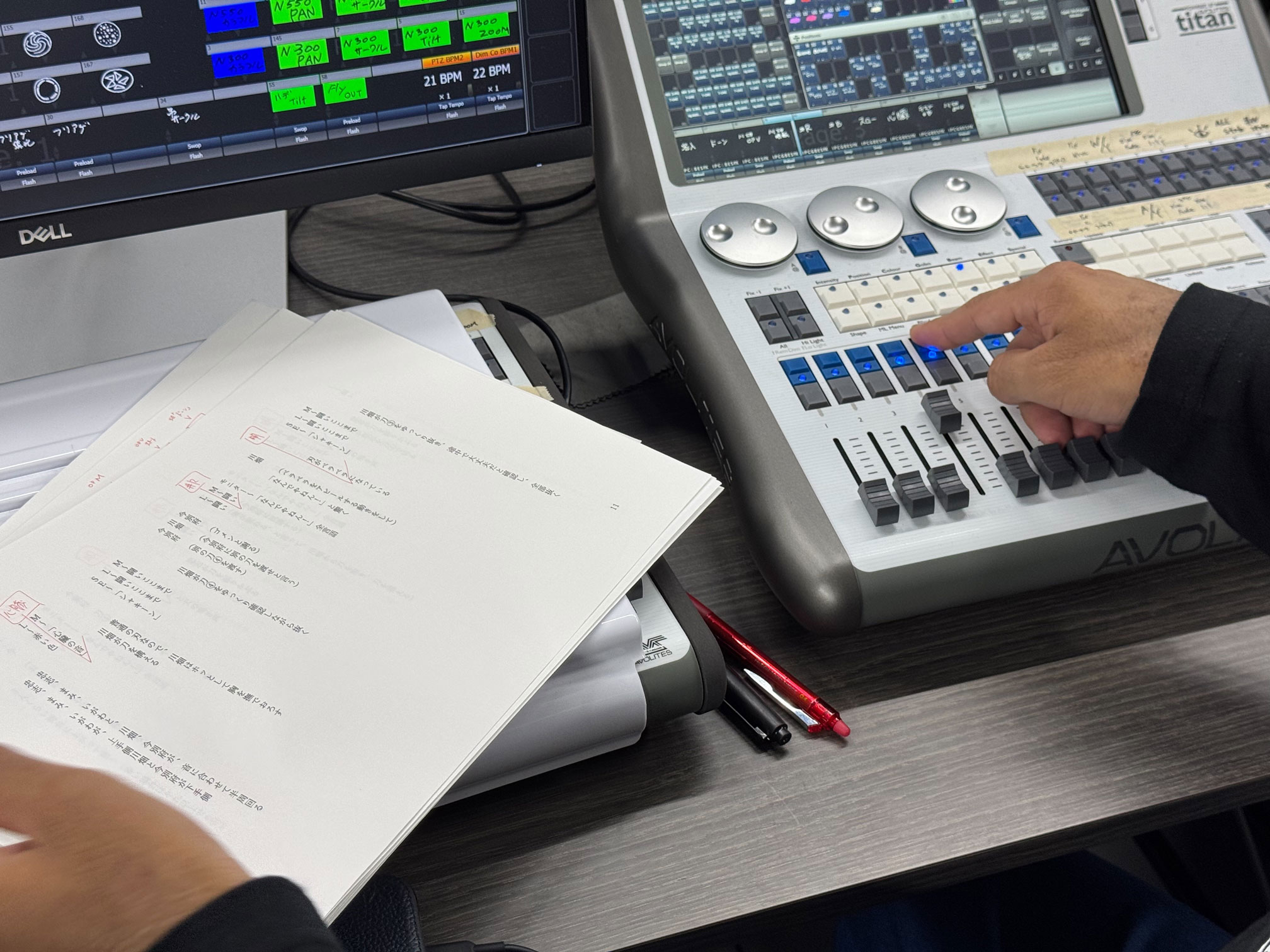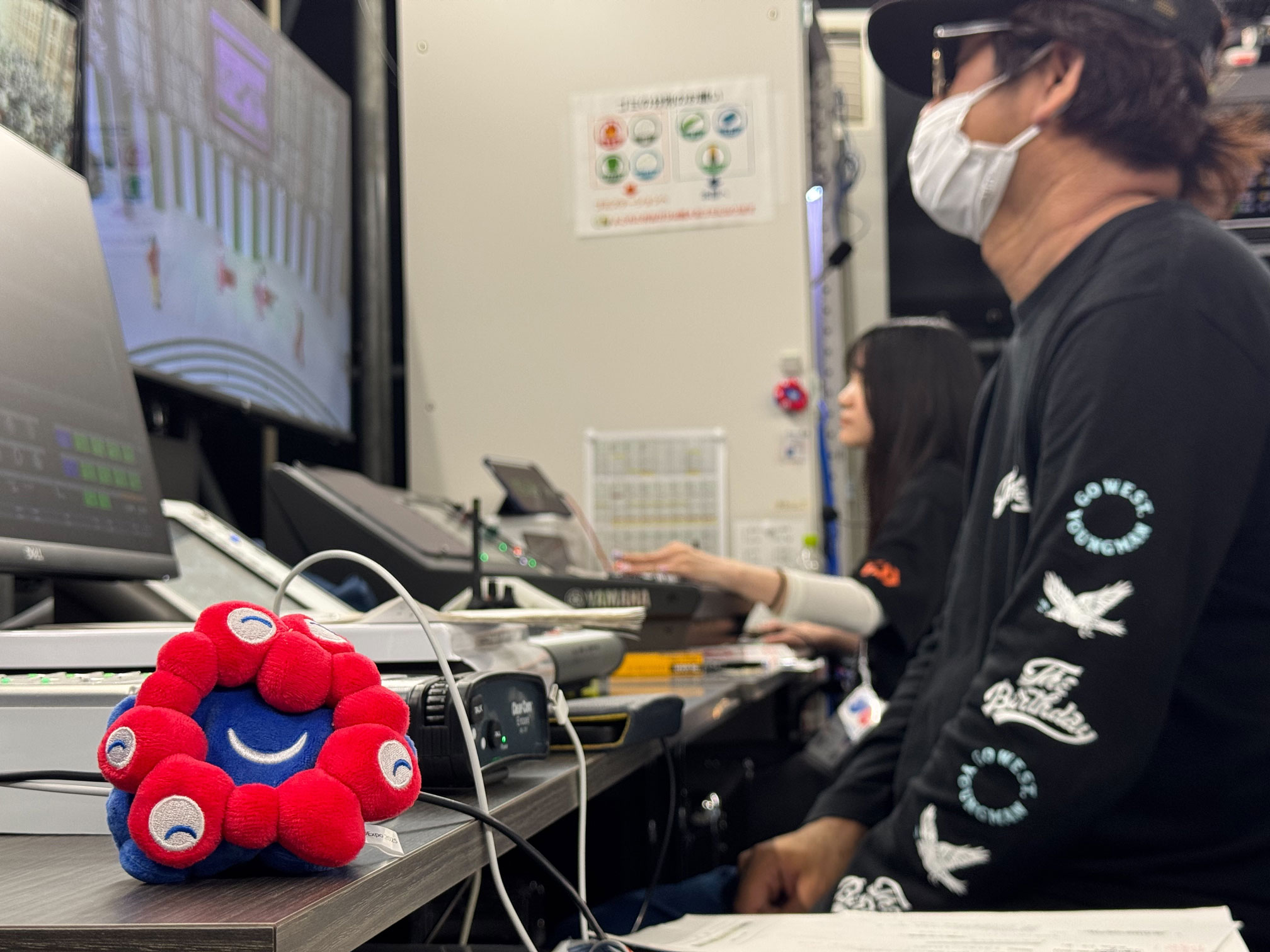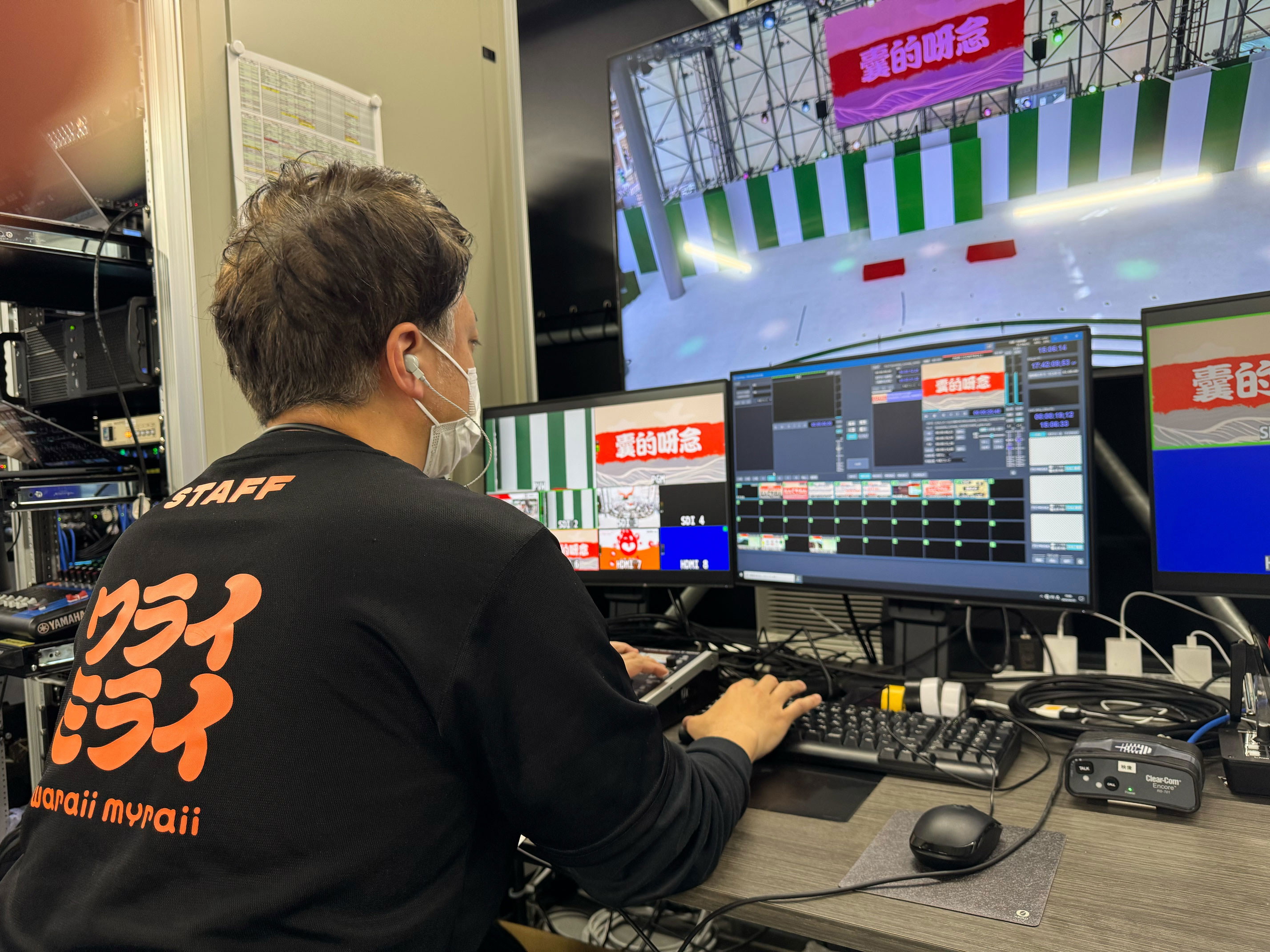 ステージや客席の構造上、直接ステージが見えない室内におり、モニターを見ながらオペレートをしています。万人に向けたノンバーバルコメディやカラオケ盆踊りなどを行っていて、日頃のお笑いライブとはまた少し違ったステージで毎日新鮮な気持ちです。